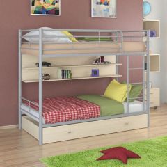 Кровать комплектуется вместительным выкатным ящиком для постельного белья или других вещей. Над нижним спальным местом располагается полка, на которой удобно разместить книги или аксессуары.