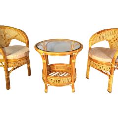 Комплект из натурального ротанга, состоящий из двух кресел и круглого столика с плетеной столешницей. Стекло входит в комплект.